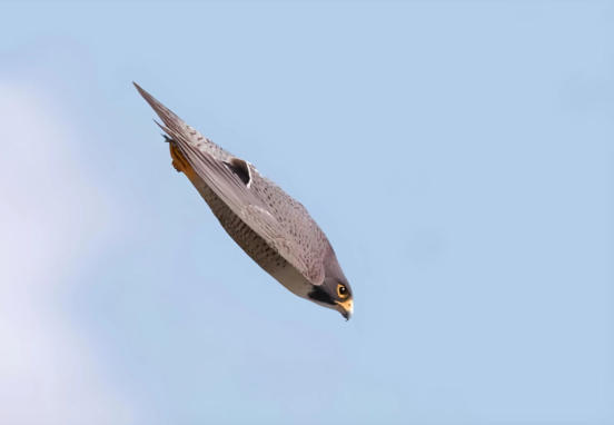 Ofalcãoperegrino,nomomentodoataque,elefechaasasaserealiza ummergulhoatingindoavelocidadede390km/h.Osfalcõespodem acelerarde160km/hamaisde320km/hemoitosegundosembusca de uma presa.