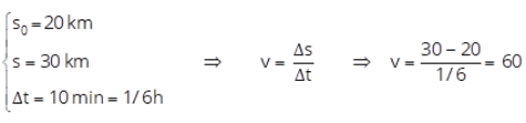 Veja que o tempo está em minutos, e as posições em quilômetros, assim, é conveniemte transformar o tempo em hora.Com uma simples regra de trê podemos transformar 10 min em hora.Agora podemos determinar a velocidade em km/h.Caso fosse solicitado o valor da velocidade em m/s, teremos: